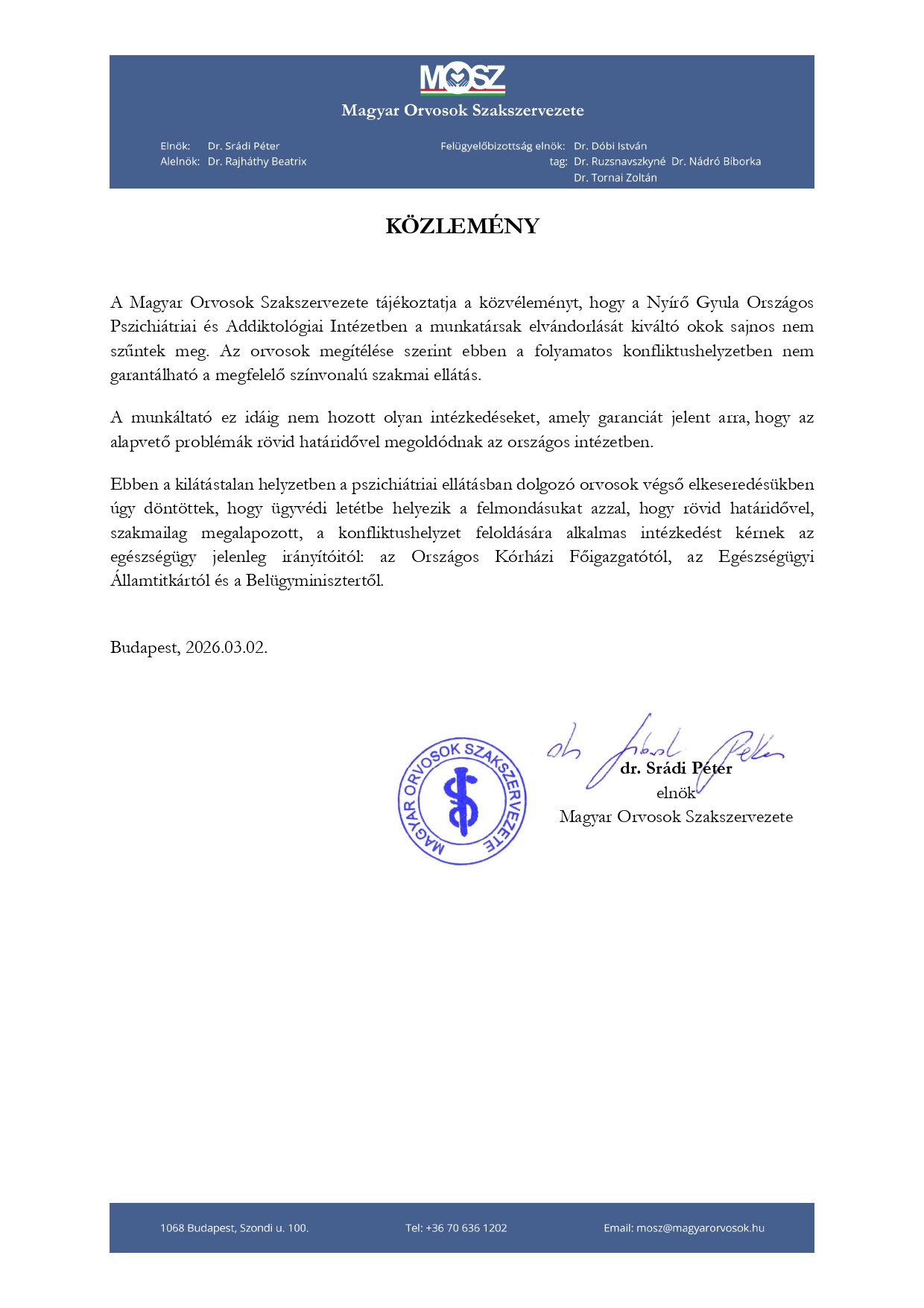 A Nyírő Gyula Országos Pszichiátriai és Addiktológiai Intézet munkatársai ügyvédi letétbe helyezték felmondásukat, mert álláspontjuk szerint nem szűntek meg az elvándorlást kiváltó okok. Sürgős, rendszerszintű megoldást kérnek a döntéshozóktól.