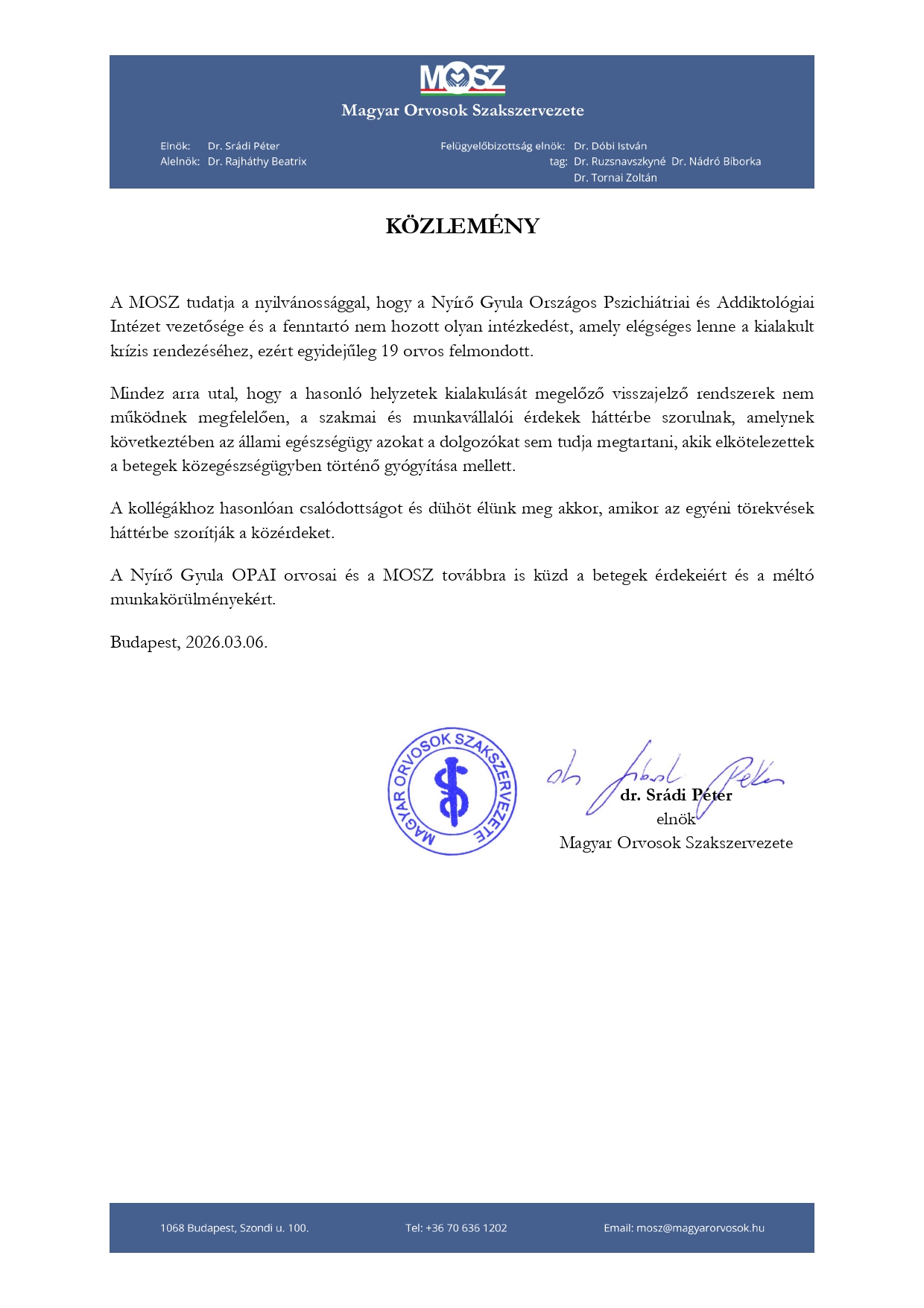 A MOSZ tudatja a nyilvánossággal, hogy a A MOSZ tudatja a nyilvánossággal, hogy a Nyírő Gyula Országos Pszichiátriai és Addiktológiai Intézet vezetősége és a fenntartó nem hozott olyan intézkedést, amely elégséges lenne a kialakult krízis rendezéséhez, ezért egyidejűleg 19 orvos felmondott.