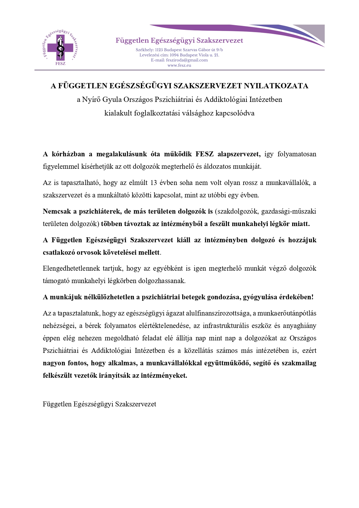 A Független Egészségügyi Szakszervezet (FESZ) teljes mértékben támogatja a Nyírő Gyula OPAI munkavállalóit, a betegek gyógyulása csak akkor biztosított, ha a gyógyítók is megbecsülve érzik magukat.