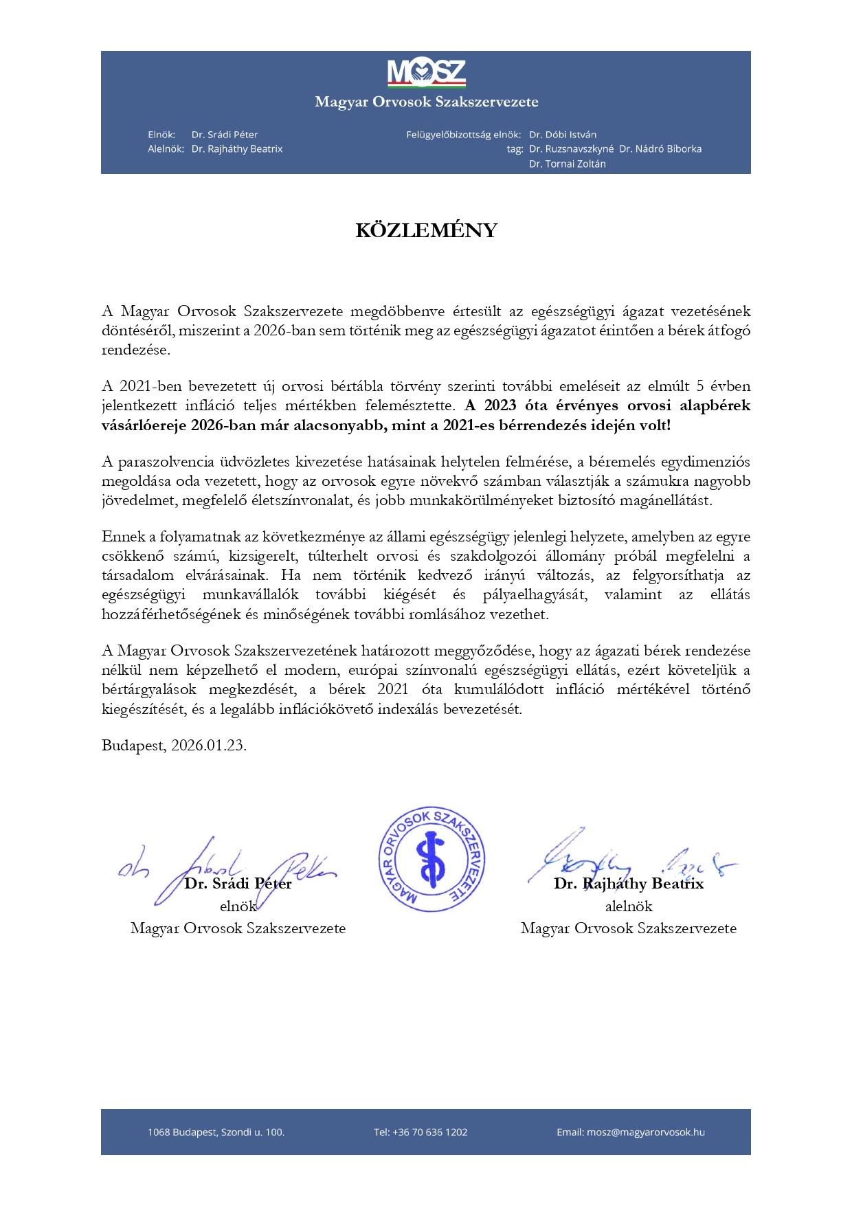 A Magyar Orvosok Szakszervezete elfogadhatatlannak tartja, hogy az ágazatban 2026-ban sem történik átfogó bérrendezés. A 2021-es béremeléseket az infláció teljesen felemésztette, a mai orvosi bérek vásárlóereje már alacsonyabb, mint öt éve.