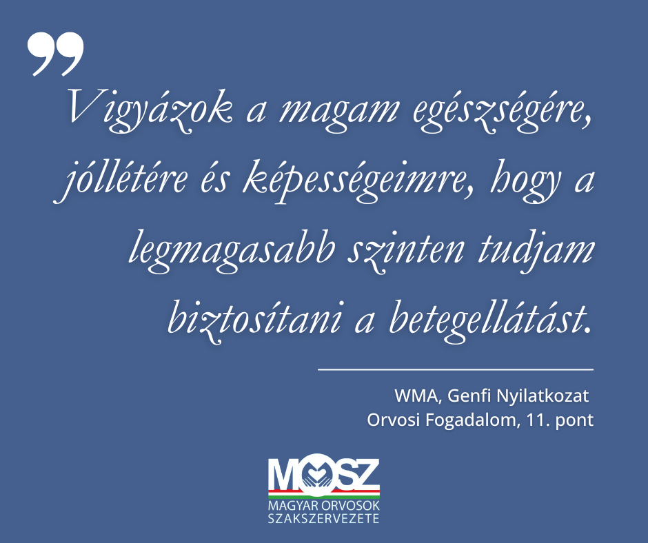 Ez a mondat a Hippokratészi eskü modern változatának javaslatából származik, amelyet az Orvosi Világszövetség (WMA) a Genfi Nyilatkozatban dolgozott ki. A szöveg emlékeztet arra, hogy a betegellátás minősége szorosan összefügg az orvos saját testi-lelki egészségével. A mindennapi valóság azonban ennek gyakran éppen az ellenkezőjét mutatja.